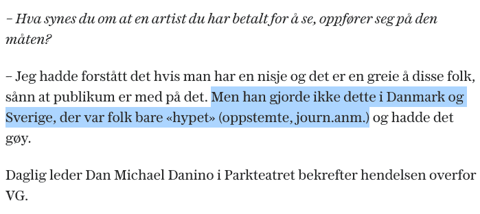 Da rapgruppa Earthgang spilte på Parkteateret 11. september kalte oppvarmingsartisten Wifisfuneral publikum for nynazister, fordi … de fleste i publikum var hvite og noen var litt frekke i kjeften (?). Han var visst ganske full, mr. Funeral, men det er selvsagt ingen unnskyldning. Hvite nordmenn som drar for å se Earthgang og Wifisfuneral en helt vanlig (vel, ikke heeeelt) onsdag er ikke nynazister, de har bare dårlig smak. Litt som nynazister! Vi tar tilbake alt: Woke!