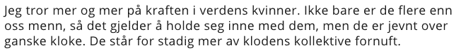 Men premisset her er litt … rart. Kvinner står altså for stadig mer av klodens kollektive fornuft? Er det virkelig slik at det som har forandret seg er at kvinner har blitt glupere sånn … nå i det siste?